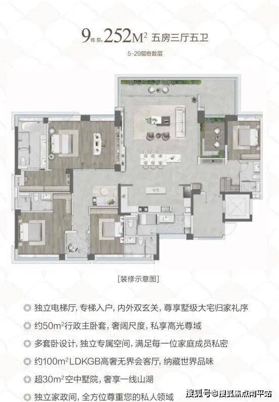建面约252㎡5房2厅5卫,专梯入户,内外双玄关,真正将别墅私密尊贵的归家仪式搬进高层。