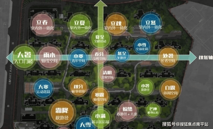 【景观设计】打造“24 时节四季理想家”景观大师易兰规划设计院执笔造景,以“两轴一环三大区”手法,以四季如春为主题,打造“24 时节四季理想家”的双中轴园林。