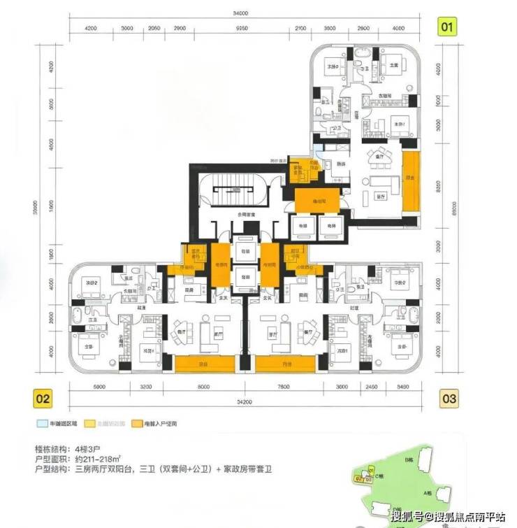 中信信悦湾大平层住宅由211-218㎡、302㎡、370㎡、510㎡共4种户型组成,以下是小区楼栋分布平面图、户型图和视野模拟图: