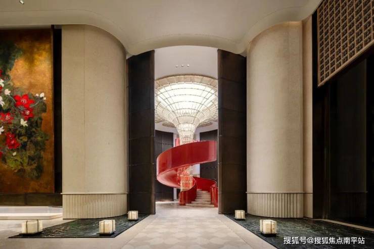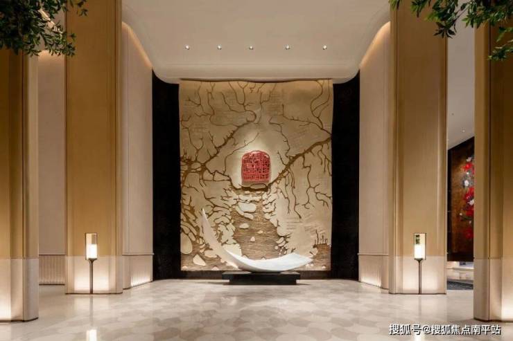 大堂的地面水刀拼花,用的是中国古代建筑窗饰中等级最高的「三交六椀菱花」。大堂中央名为《潮涌》的雕塑,是英国雕塑家约翰·阿特金的雕塑作品。