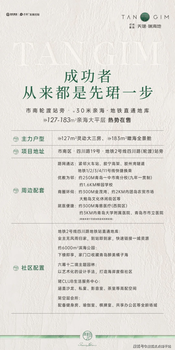青铁保利丨天珺・瑞海地承袭央企保利“天系”产品基因,结合青铁置业丰富的TOD项目开发经验,地铁2号线四川路(轮渡)站直通地库,实现“到站即到家”的便捷,为青岛改善客群量身定制海岸TOD生活新范式。
