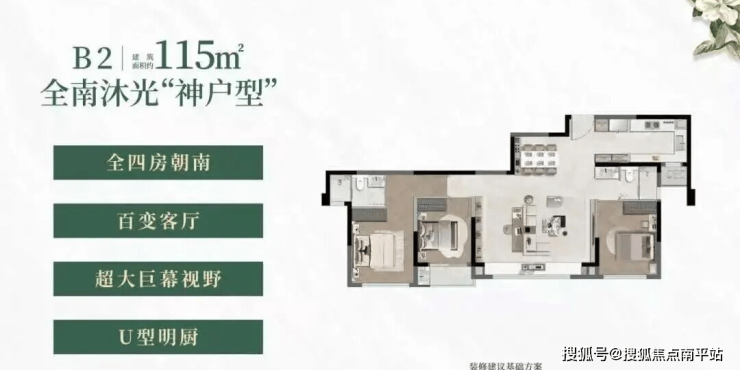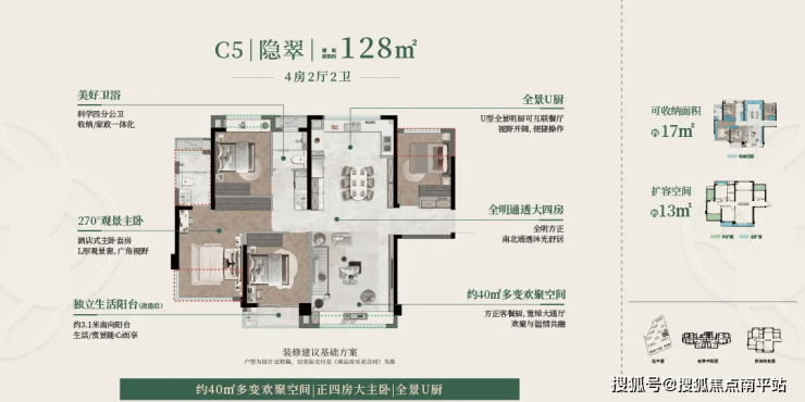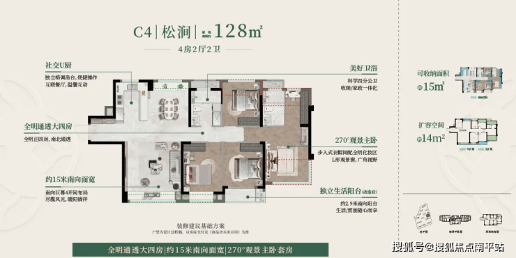 建面约 128㎡户型:边套设计,三面采光,南向面宽约 15 米,含 270° 观景主卧套房及全景 U 型明厨,部分户型配备独立玄关与约 40㎡客餐厅。