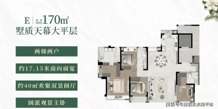 建面约 170㎡户型:两梯两户布局,南向面宽约 17.15 米,包含约 40㎡客餐厅、U 型中西双厨及主卧套房,适配多代同堂家庭。