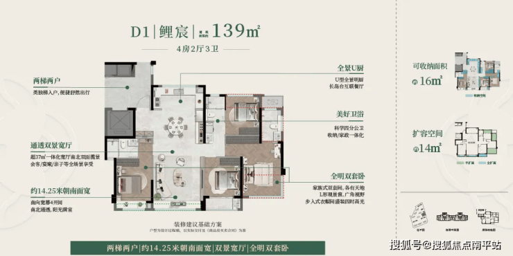 建面约 139㎡户型:两梯两户,类独梯入户设计,南向面宽约 14.25 米,双套卧布局,客餐厅采用 LDK 一体化设计并衔接南北双景观。