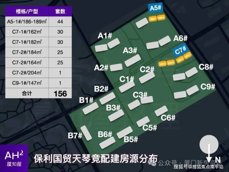 保利国贸天琴竞配建房源共156套,A5号楼1梯186-189㎡44套、C9号楼1梯147㎡1套,C7号楼162-164㎡55套、182-187㎡55套、205㎡1套。