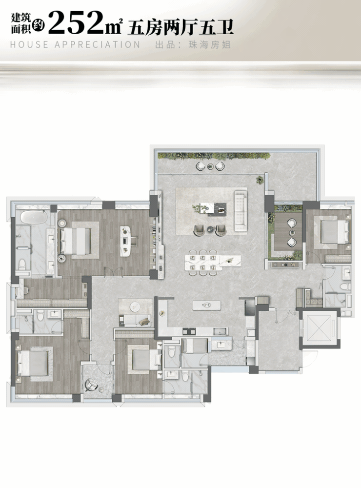要是需求更高,252㎡的户型直接把“高端改善”拉满——珠海首个四套房+主卧三开间+四阳台设计。