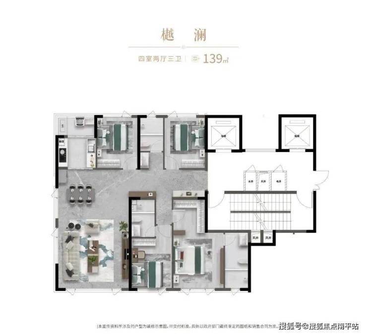 再来看约139平户型,同样也是私梯入户,经典“卷王”产品,大横厅布局,餐客厅270°全景舱设计,南向双套房。