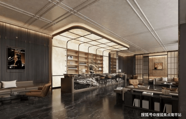 借鉴飞艇设计打造入户大堂,弧形穹顶与石材碰撞。通过精准曲面比例,塑造视觉失重,营造悬浮美感。