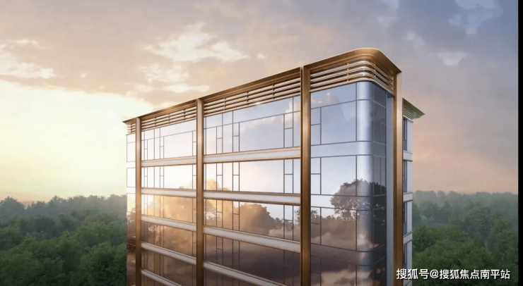 古铜金属构件铸就建筑骨架,打造鎏金塔冠,营造 “日照金山” 奇景。融入游艇设计元素,楼宇顶部起伏呼应。