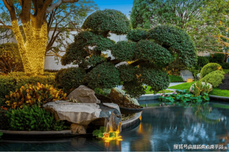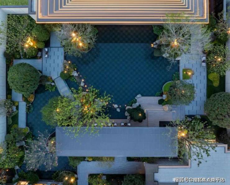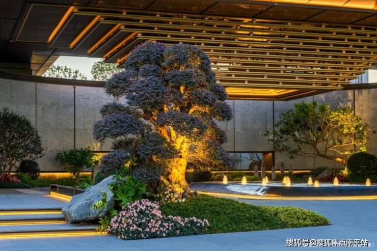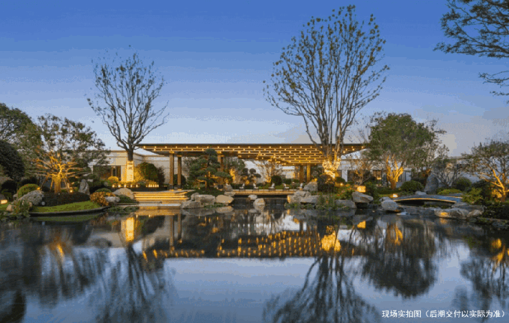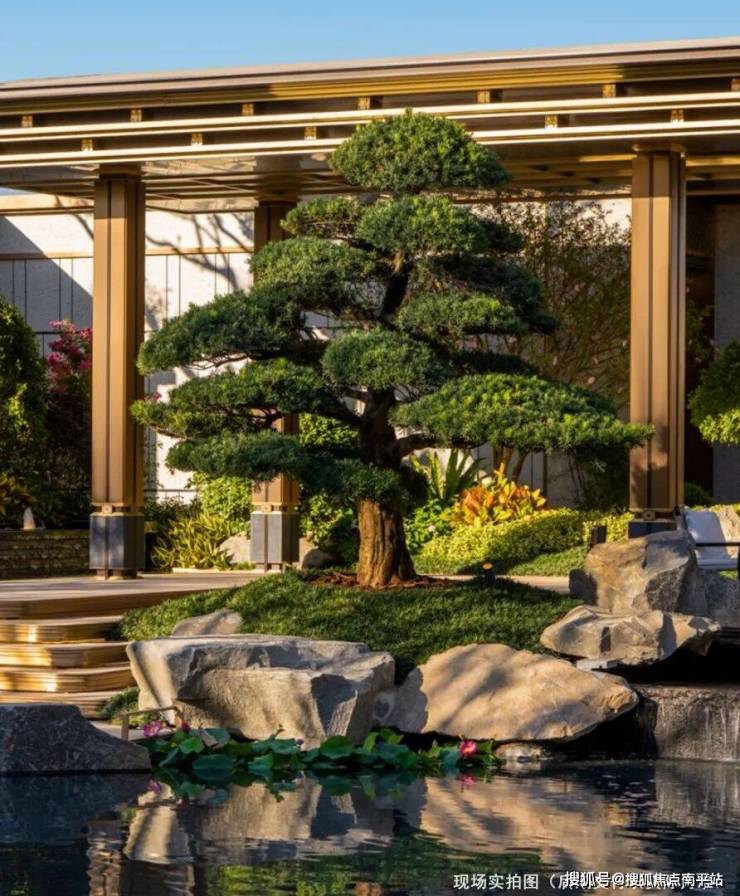 穿过大门,三进院落的东方礼序徐徐展开: "四水归堂" 以定制层级屋檐与红果冬青营造聚财纳气的意境; “沐光水院”以 超500㎡的中庭水景为核心,构筑「汀水鸣涧、飞瀑虹桥」等 九大东方景致,廊桥亭榭诗意串联,辅以造型置石,百年树龄香樟、红花檵木桩、进口罗汉松、香樟、紫薇等名贵花木,尽显诗意东方园林的奢华与雅致。