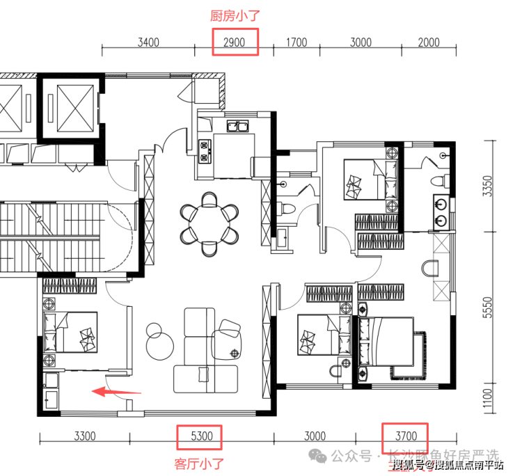 但毕竟面积缩小了4㎡,客厅、厨房的面宽有所缩减;