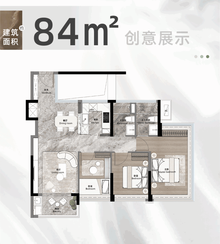 99平户型:IMAX宽景阳台、主卧三面环幕视野设计,室内就像一座移动的观景台。
