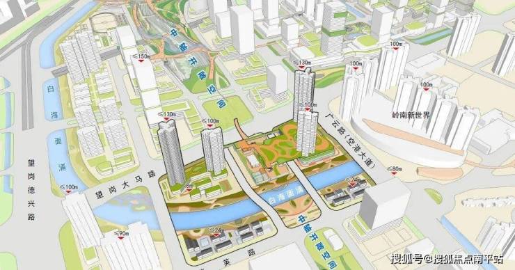 将采用“水岸共生”理念,以白海面涌为生态主轴,构建滨水慢行廊道。同时沿嘉禾望岗上盖设施打造景观化中轴公园,塑造片区创意活力。(非项目配建,以政府官方公示为准)
