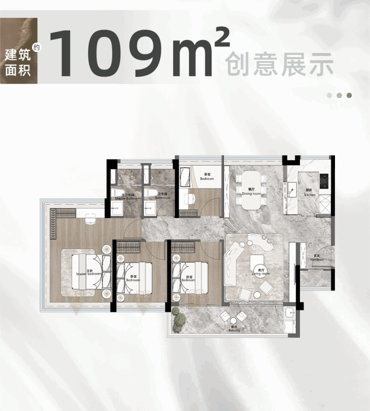 建面约109㎡四房,四房两卫,南北对流设计,通风采光更好。
