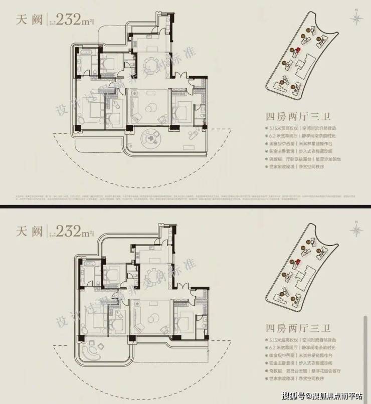 232㎡的户型在200㎡的基础上更加特别。它拥有豪华厨房,具备御宴级厨房空间,中厨的厨灶,西厨的岛台、操作区、蒸烤箱皆可同时拥有,米其林星链操作台高效支撑每一次家宴。同时,该户型尺度豪横,足足可以拥有5个X空间(扩展空间)。主卧可以塞得下一个带水吧台的小客厅,南向的次卧可以拥有灵动空间,如果作为小孩房,童年时期孩子的房间里就可以拥有独立的一块游玩区域;青少年时期,孩子则可以拥有独立书房、与小伙伴私密玩耍的小天地,也可以作为兴趣爱好的载体,安置钢琴等大件。