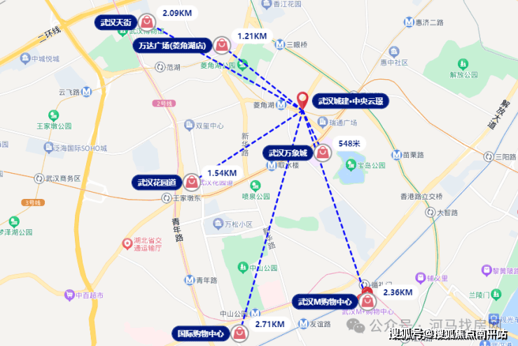 大型商业方面,距离武汉万象城最近约200多米,车都不用开,另外,项目1.5公里氛围内还有菱角湖万达广场、龙湖江宸天街、西北湖花园道等。自驾到武汉天地商圈、国广商圈的距离也不远。