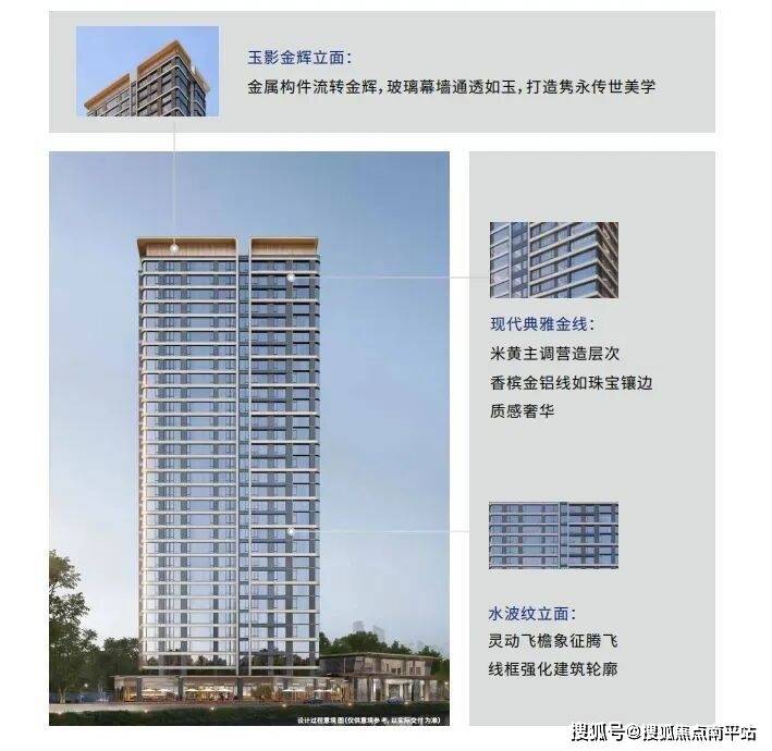 比如联发建发御湖水波纹飞檐立面,大面落地玻璃,配合香槟金铝板如鎏金缎带勾勒建筑轮廓,打造高窗墙比+270°景观面+转角采用弧形玻璃。