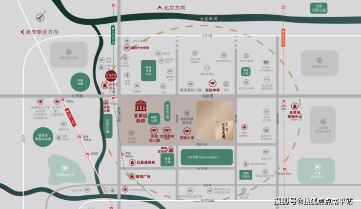 •北辰区最优教育资源:项目周边2公里范围内有19所幼儿园,6所小学,6所中学。地块西侧和北侧约600米分别紧邻北辰实验小学、北辰实验中学,约2公里则是四十七中(市重点)、华辰学校,教育资源雄厚;