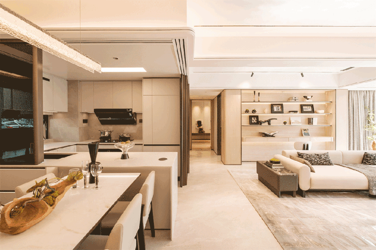 也可以打造L型玻璃推拉门,打开即可与客厅一起,连成洄游型大厅;闭合又能回归独立书房、功能室,乃至未来的二孩房。