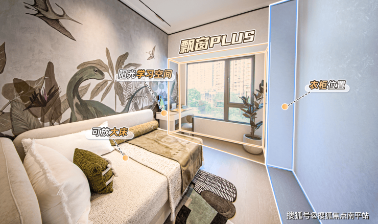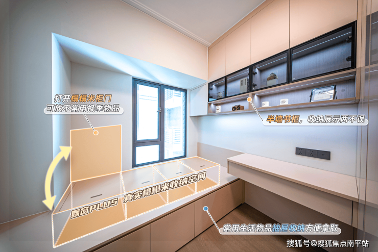 在保利和著这个卧室里,就连一个榻榻米都极具匠心,靠窗的区域由于没有传统飘窗阻碍,是直接落地的,打开柜门就可以放换季物品,床边的位置做了抽屉,拿取日常用品不用掀开床垫。