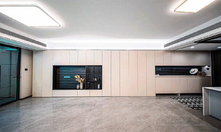 步入客厅,我们可以看见从玄关到客厅一整面墙的收纳设计,长达9.4米,近乎惊人的尺度带来了客厅的极致收纳空间。