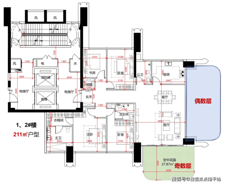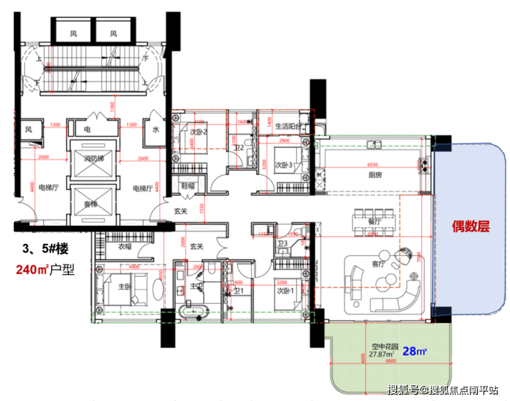 这个户型是3、5#楼的主力户型,和211㎡户型的格局基本一致,尺度放大了,北次卧增加了生活阳台,弥补了一些211㎡户型的遗憾。