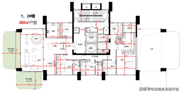 据说1、2#楼顶楼也有个类似的户型,不过套数很少,屈指可数,面积380㎡,户型格局和430㎡一样,就是缩小版的,不过也足够豪横,就是下面这个宝贝~