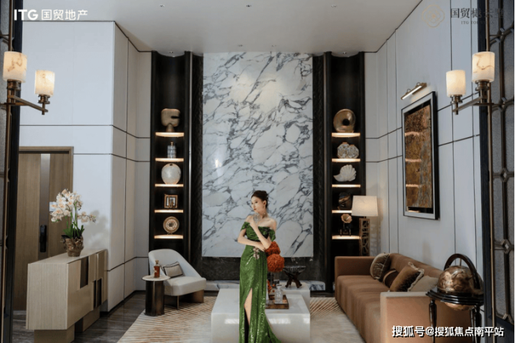 整个门厅以精致的陶瓷质感与石材相互交织。进口约百年罗汉松,树高有4.5米,形成天然的“绿色穹顶”,搭配巴西进口的宇宙金奢石水景,自带金白相间的天然纹理,像是星河倾泻,添了几分柔情。