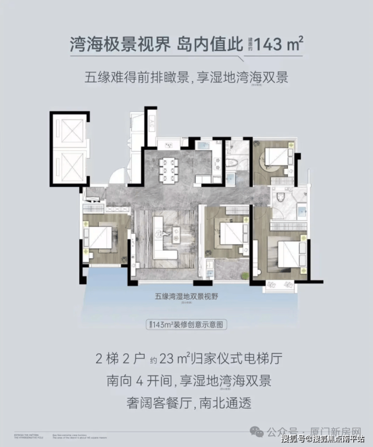 更是占 据五缘湾一线湾景,聚合了“湿地、内湾、外海” 三重超广角的景观视野。