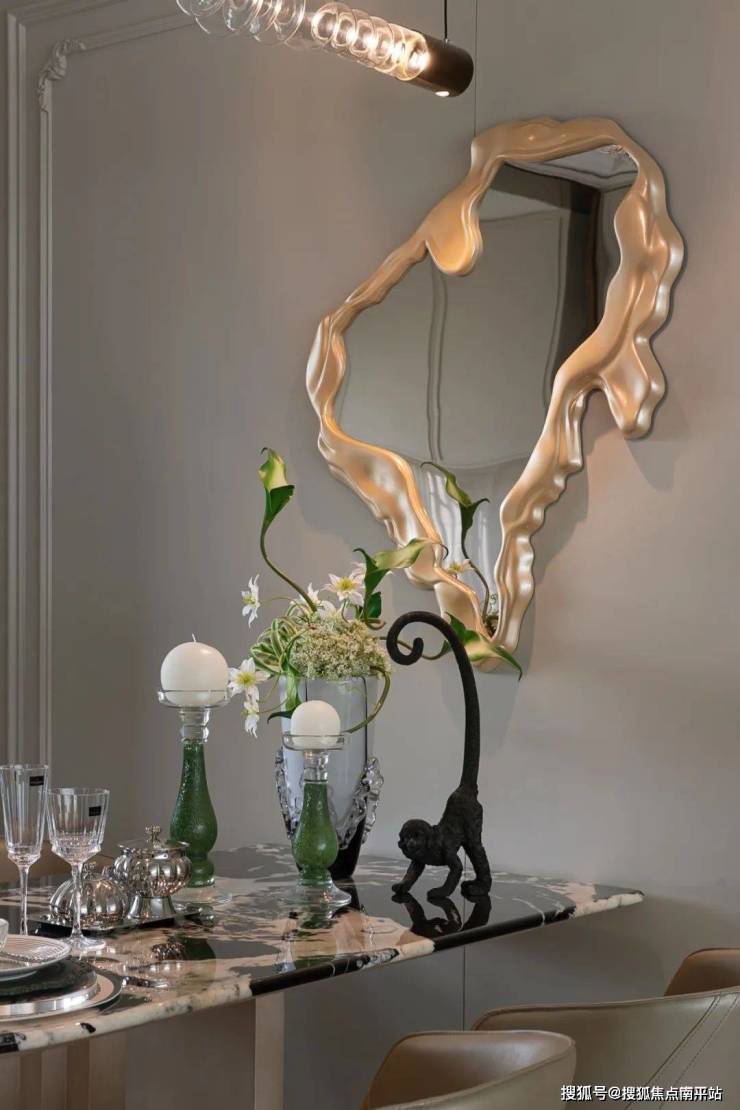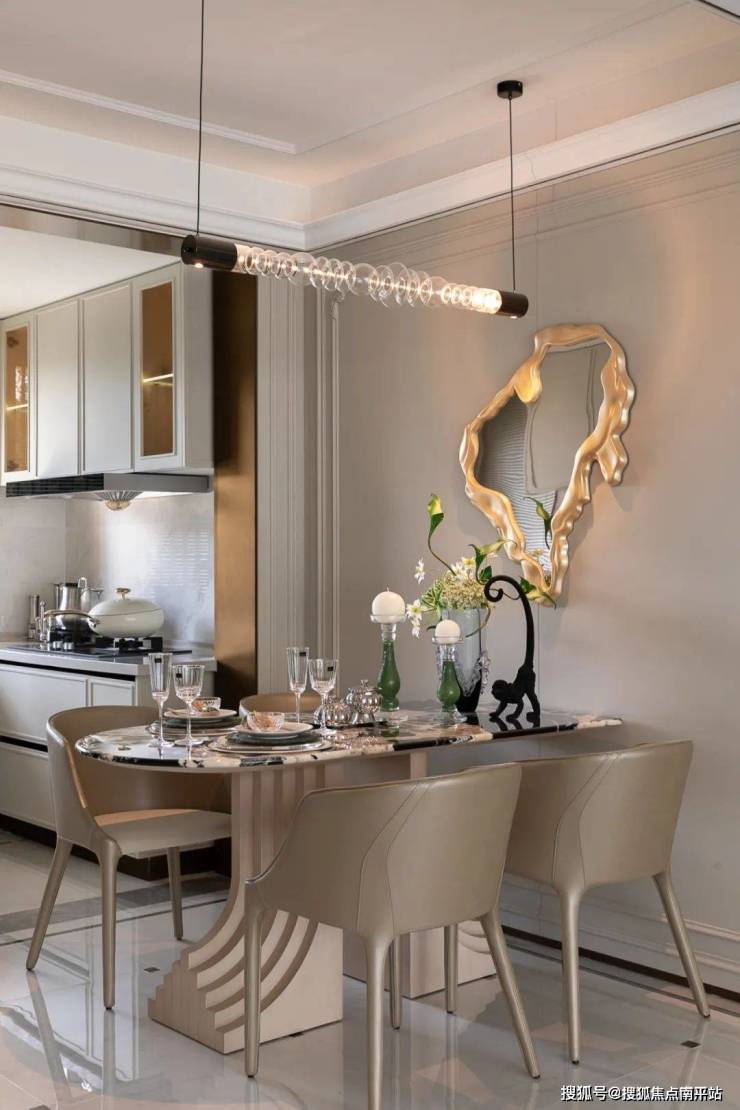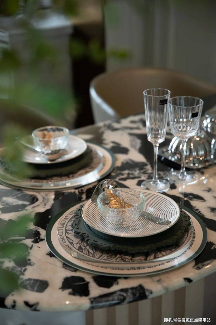黑白纹路大理石餐桌与低饱和度皮质餐椅,以几何线条勾勒用餐仪式感。细腻的餐具与精致的装饰品,暗藏法式宴饮的精致逻辑。