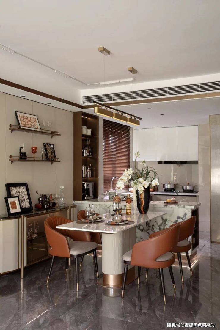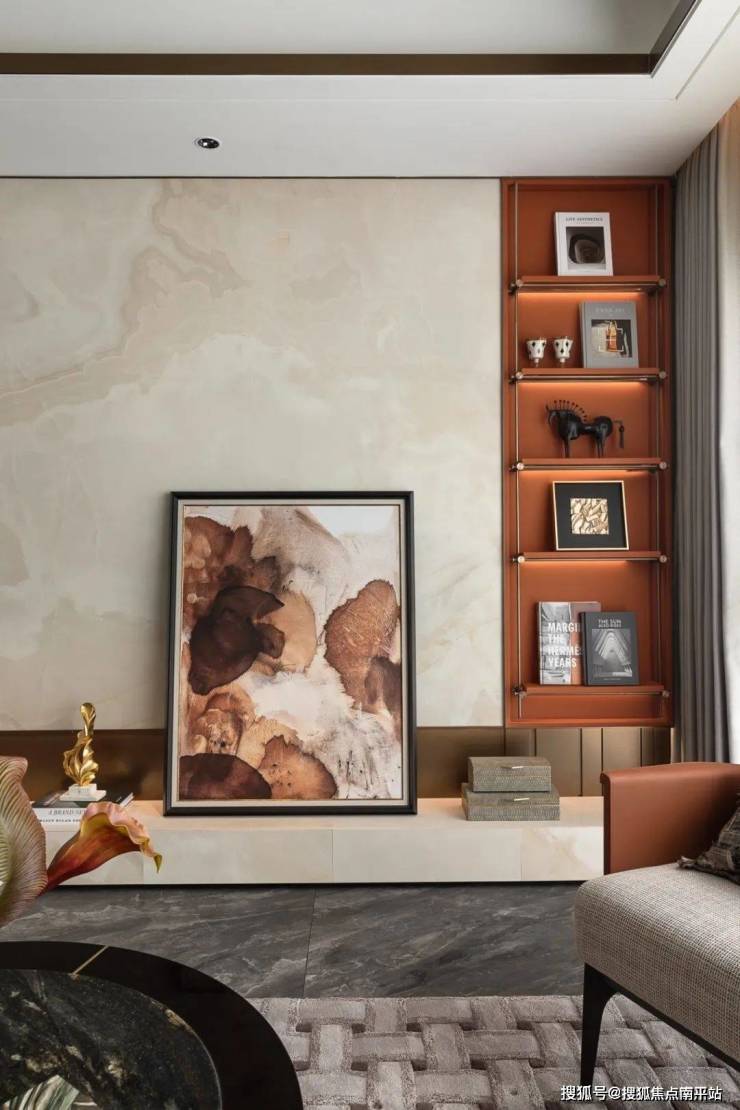 爱马仕橙与米色在此上演色彩协奏,碰撞出高级感与温度并存的空间叙事。整面的玉石岩板,则如大自然馈赠的艺术品,流淌着诗意与想象。