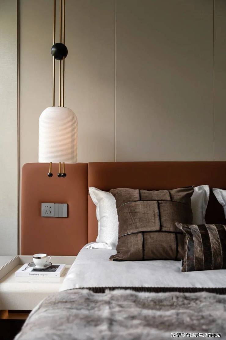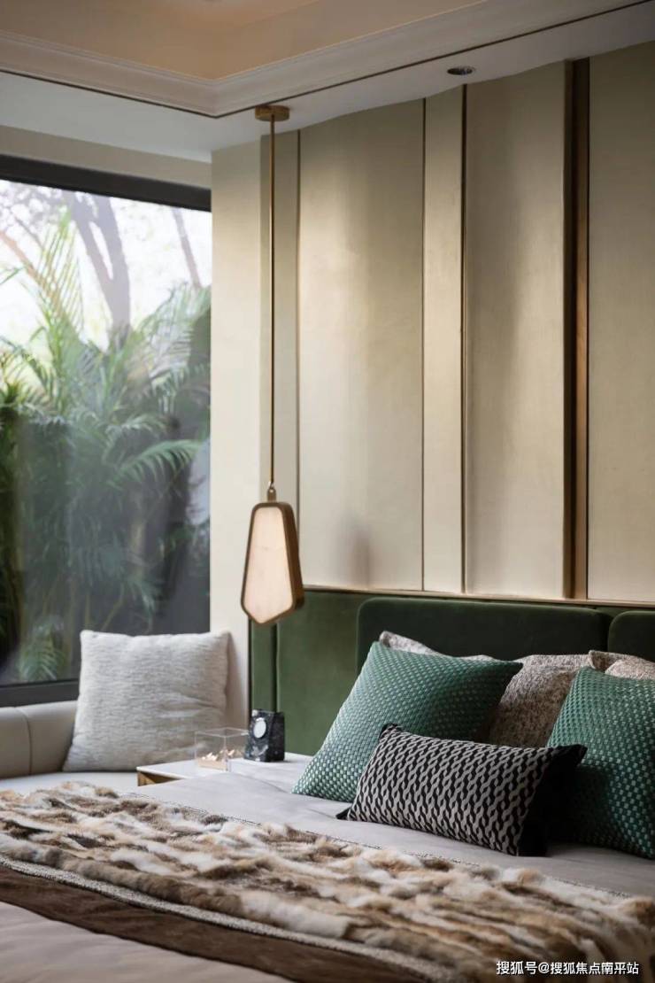 深绿色丝绒床头靠背与温润的大地色系床品交相呼应,赋予空间沉稳而富有质感的基调。金属元素点缀床头柜与吊灯之中,提升空间的精致感与奢华气息。