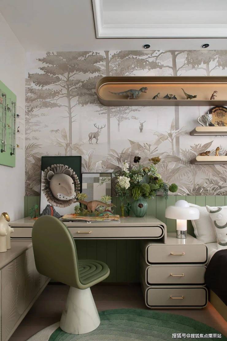 丛林主题壁纸×柔粉灰调,打破空间局限。墙面暗藏自然生机,赋予童年探索的趣味与治愈力。
