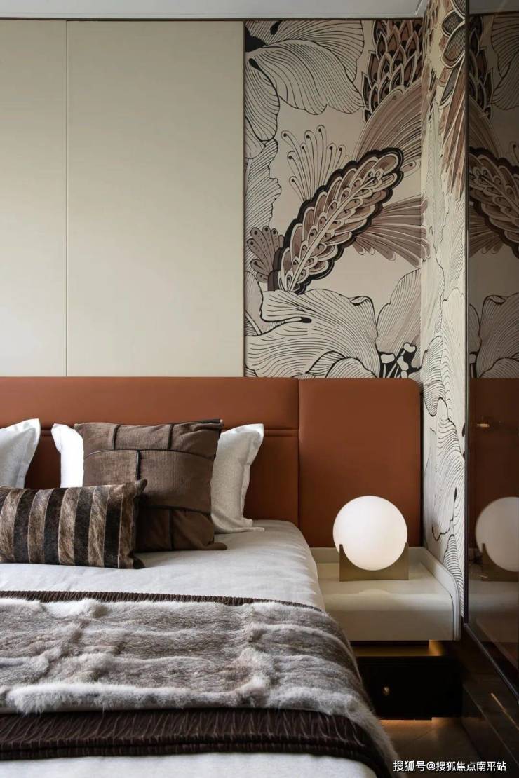 米色线描花卉背景墙,细腻而不失格调,当自然光影从大面积窗户洒入,简约吊灯点亮温暖层次,宁静中暗藏艺术流动感。