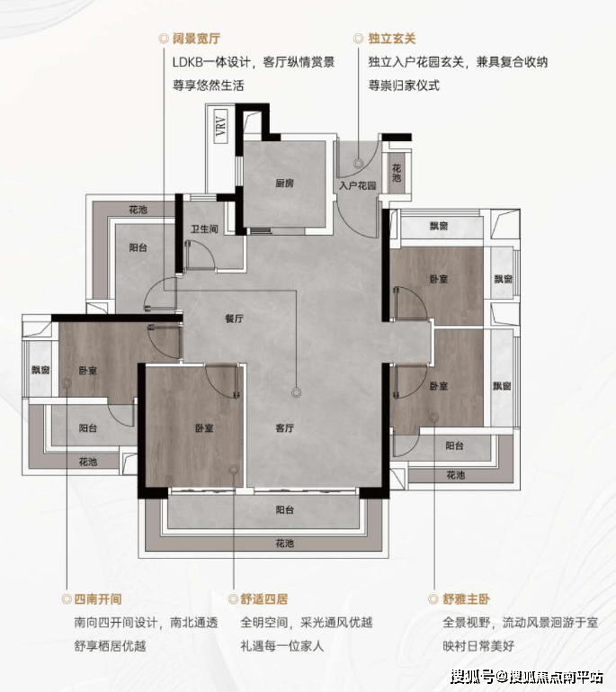 是个南北对流的户型,四开间朝南。南面做了宽阳台的设计,加上花池的赠送,空间阔绰;北面餐厅报备了花池,可做餐边柜摆放杂物形成对流。