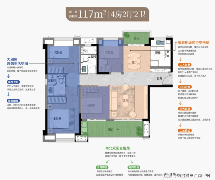 ·少承重墙设计,创新布局,“客厅与南向次卧、餐厅与北向次卧,南向主次卧”皆非承重墙衔接,大幅提高空间灵活性和可改造性,是市面上少见的可变四房户型,能够随着家庭成长周期的变化,进行相应的调整和改造,真正实现“百变空间”设计理念。
