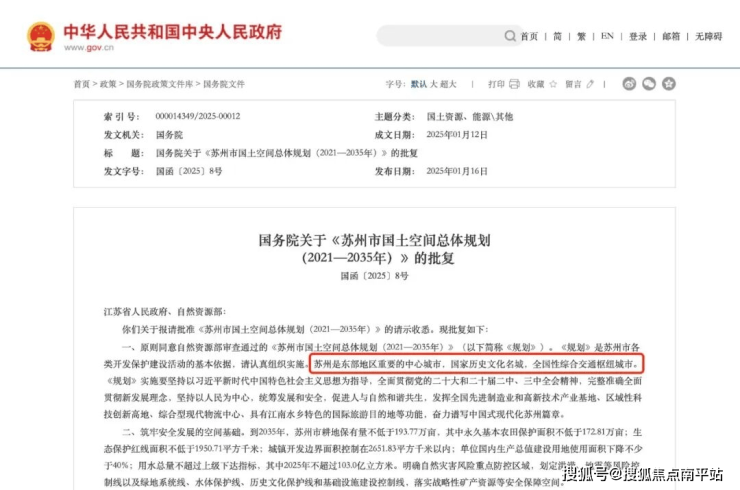 2025年1月12日,国务院批复了《苏州市国土空间总体规划(2021-2035年)》,这是苏州历史上第一部“多规合一”的国土空间总体规划。 国务院批复明确苏州是东部地区重要的中心城市,国家历史文化名城,全国性综合交通枢纽城市。