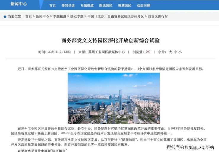 2024年11月,商务部发布《支持苏州工业园区深化开放创新综合试验的若干措施》。其中提到了支持苏州工业园区根据发展需要和国土空间规划适时扩区;高标准规划建设桑田科学岛、建设一批海外离岸创新中心;推动苏淀沪城际铁路接入虹桥综合交通枢纽与上海机场联络线贯通运营……通过科技创新、高新产业、城建规划等,全方位力挺苏州工业园区,力争5年内,建成开放创新的世界一流高科技园区。
