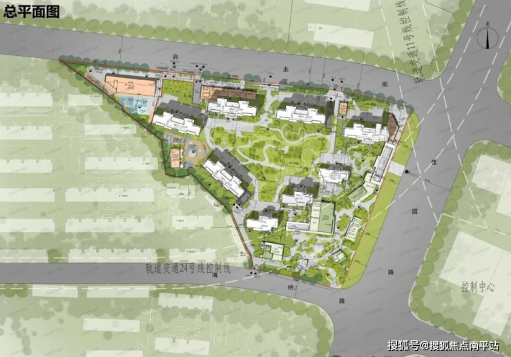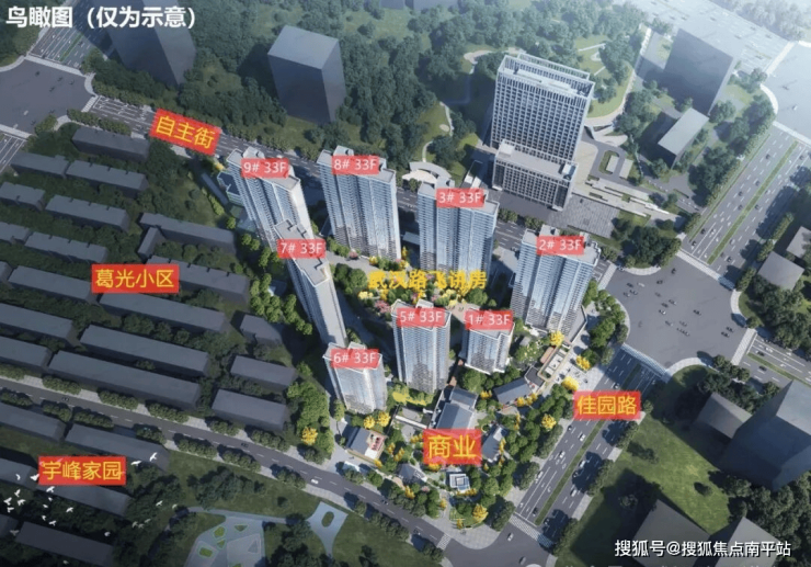 从平面图来,B地块形状不规则。北侧、东侧、南侧均为道路,西侧为现状住宅。8栋住宅呈现围合式布局,形成了比较集中的园林空间。7、9号楼为南偏西朝向,其它楼栋基本为南北朝向。33层的2、3、7、8、9号楼可见连廊结构。