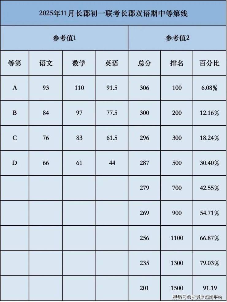2025年11月份长郡系初一联考,郡外本部与南校区合并统计。前15%分数段,郡外略微强于长郡双语;前40%分数段,两者大体相当,长郡双语微有优势。