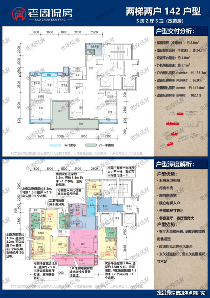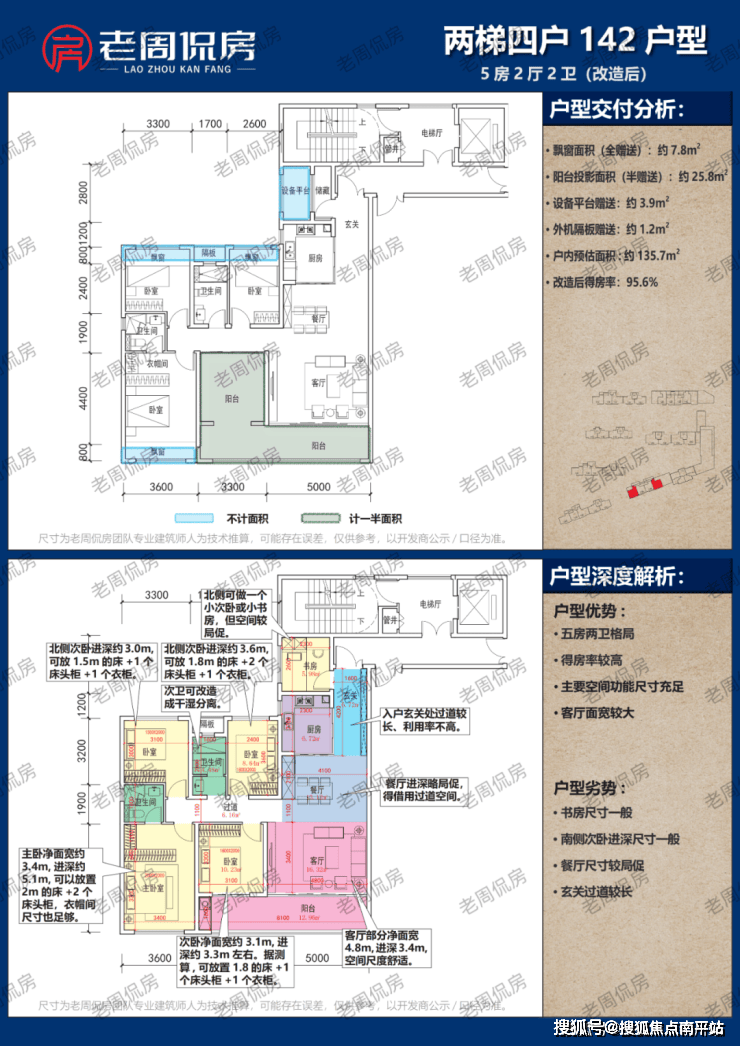 3开间朝南、南向面宽只有11.9米;同样5房,得房率约95.6%。