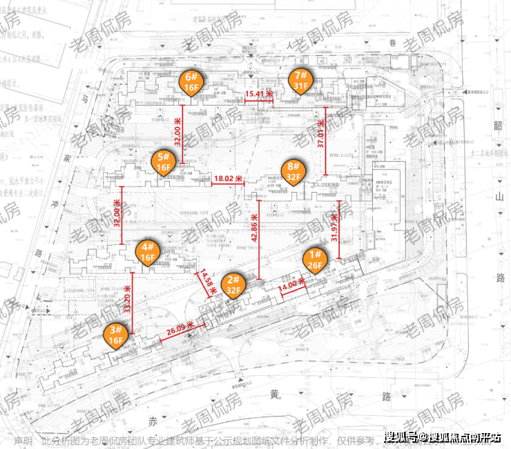 主要是东侧1#、2#、7#、8#栋为高层,高度约75-100米,这个30多米的楼间距就不够看了。