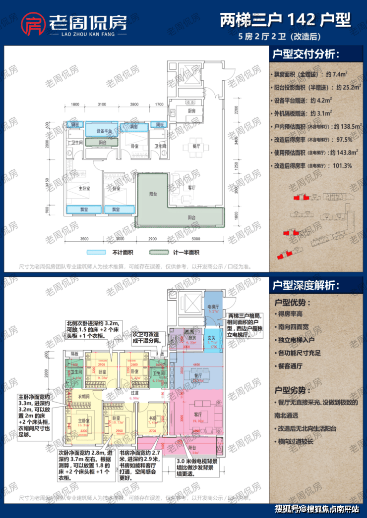 可以改造成5房2卫,户内面积约138.5㎡,得房率约97.5%。