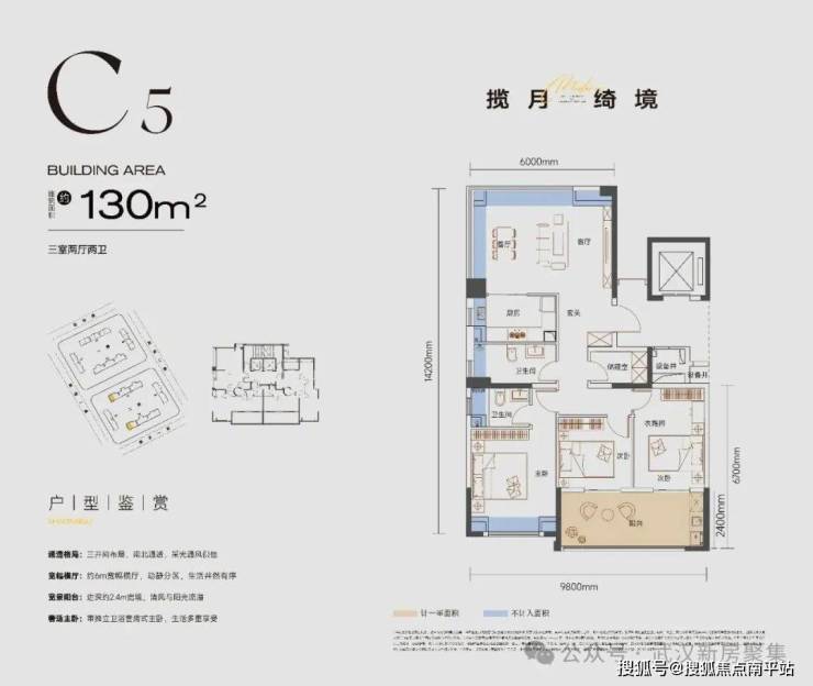 ①122%实际得房率:通过约56平三大露台、2.4米宽大阳台、客厅挑空、飘窗等方式整体赠送面积达到108㎡,得房率122%。