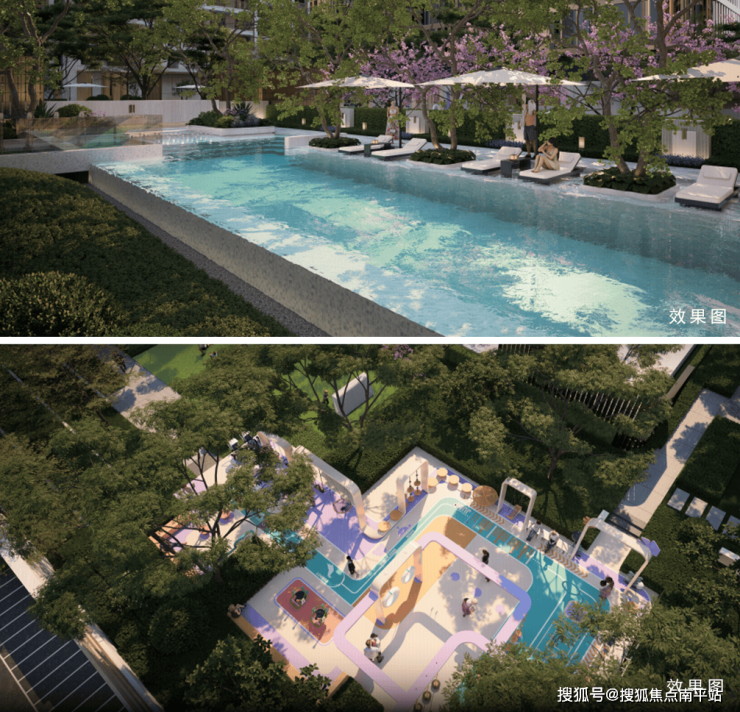 【“一芯”全景剧场】包含度假泳池、热力营地、口袋花园、活力剧场,让业主过上一种足不出户即可享受微度假、户外露营、都市松弛和全龄社交的多元化休闲生活。
