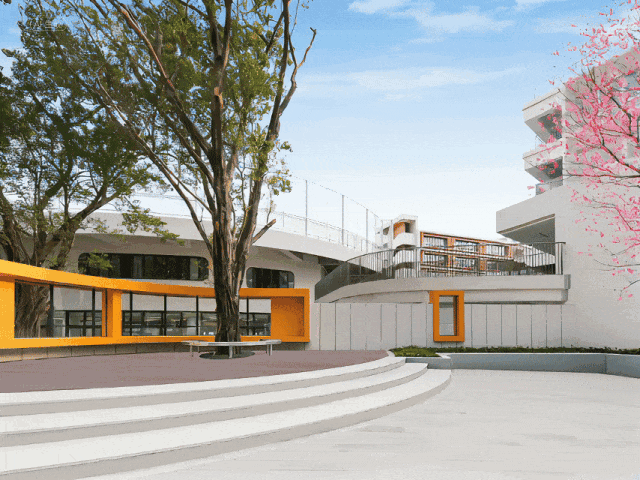高大的教学楼、宽敞的体育场,且抬高的运动场底部,设置下沉式篮球场、兴趣大道、游泳馆、科技馆、艺术厅等场馆。