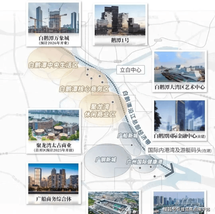 作为西翼CBD,则以重奢为支点、以沿江带为依托,开辟了一条带状连片、向外辐射的发展路径。白鹅潭不但产业猛进,各个维度的兑现相当“勤奋”。从搞商业、促旧改到建枢纽与修路桥,整个板块总让人常看常新。