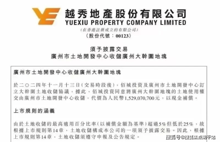 2024年11月13日,地块由广州土发中心中心收储,越秀地产因此将获得15.29亿元的现金补偿;