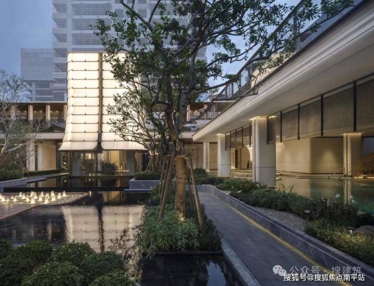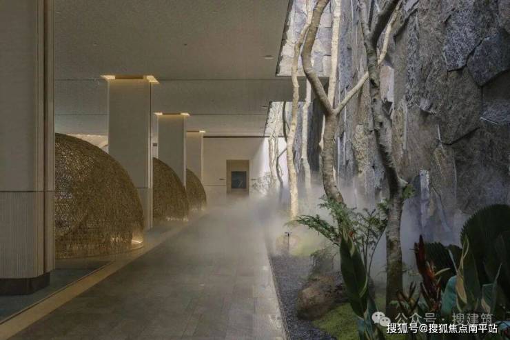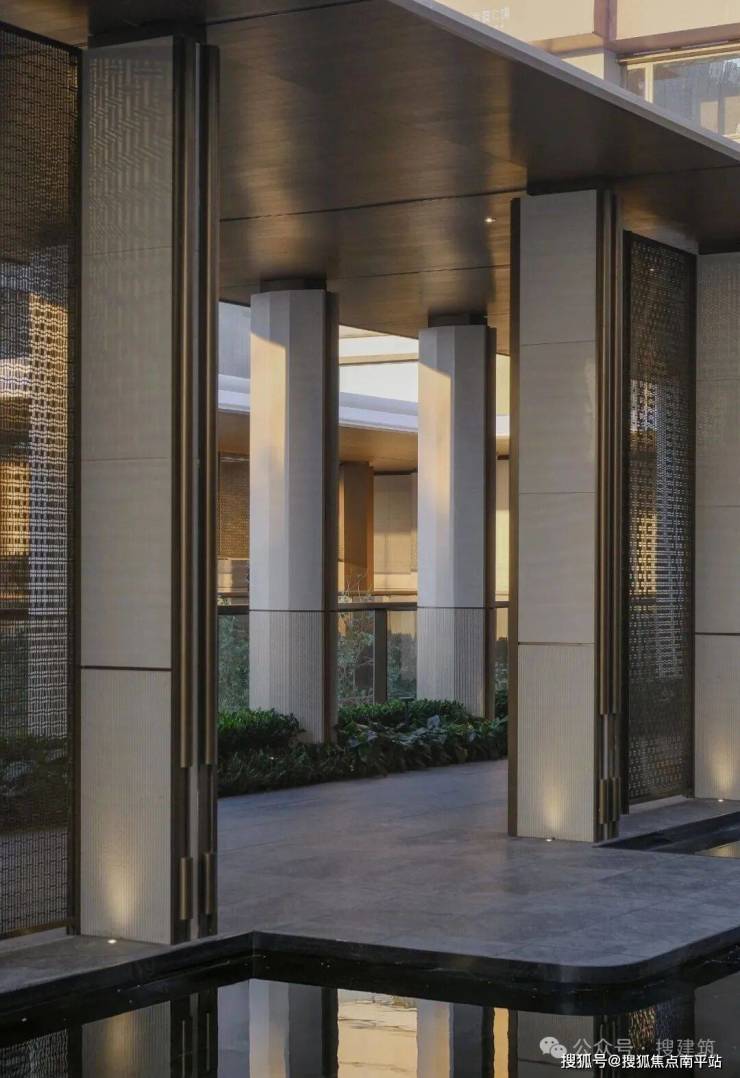 穿过归心长廊,便抵达项目"心脏地带"——中庭花园。这里被设计为开放流动的生态空间,将建筑、水景、植物与光影融为一体。花园以贯穿南北的镜面水道为核心,两侧设置方形花坛,种植形态优雅的乔木。环绕花园的是连续廊道系统,连接各功能区。半开放式泳池将内庭景观延申至天然石材堆砌的山体墙,墙上生长的细长树干向上伸展,阳光从洞口散落,展现破土而出的生命力。
