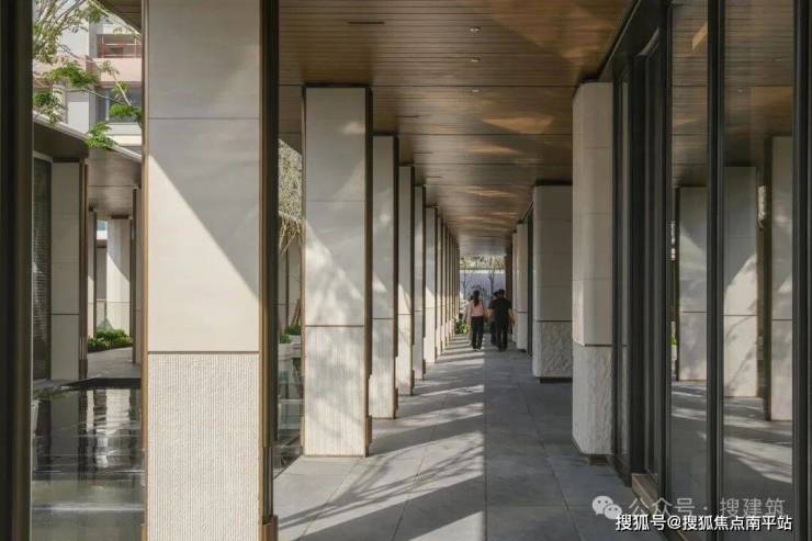 "归家序曲"是整个归家旅程的最后一程,连接公共区域与私人住宅。这段东西向长廊延续中庭花园轴线,立面采用浅色石材柱廊与木色金属格栅交替排列,形成节奏感强烈的竖向肌理。檐口微微出挑,形成半遮蔽廊下空间,既阻挡直射阳光,又保持通透感。光线透过格栅在地面投下细密阴影,随太阳位置缓慢移动,如同时间在空间中流淌。这段空间以极致的简洁营造宁静氛围,引导人们从公共空间的喧嚣中抽离,进入私人领域的沉静。
